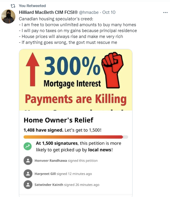 Obviously, there are many people signing this petition who are not speculators but just regular folks who cannot afford their mortgage payments now or are worried about their next renewal. There are also many thousands of families and young couples who wish to purchase a home but cannot qualify now with the higher rates. The rental market is difficult also, with rents rising rapidly.