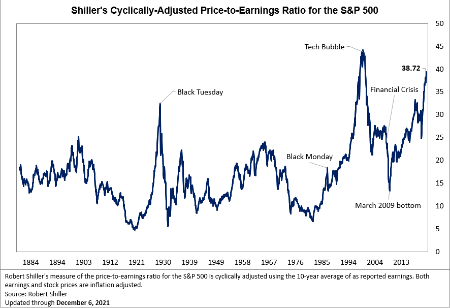 Going back to the 1880s, Shiller tracks stock prices and compares them to company earnings.
