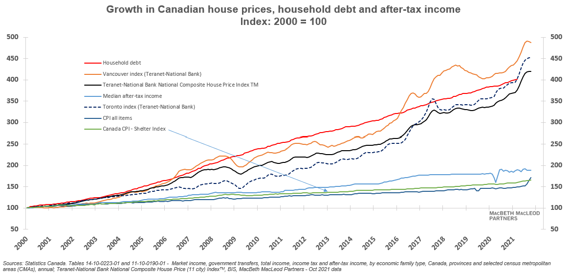 Fraser Betkowski, my associate, updates this ‘bubble chart’ each month. The chart shows house prices nationally, prices in Toronto and Vancouver, household debt levels, after-tax income and CPI. He decided to add the cost of shelter this month to show visually how ridiculously large the understatement of housing costs in the Canadian CPI is. It is easy to see the huge gap between the green line near the bottom of the chart and the three housing indices and household debt at the top.