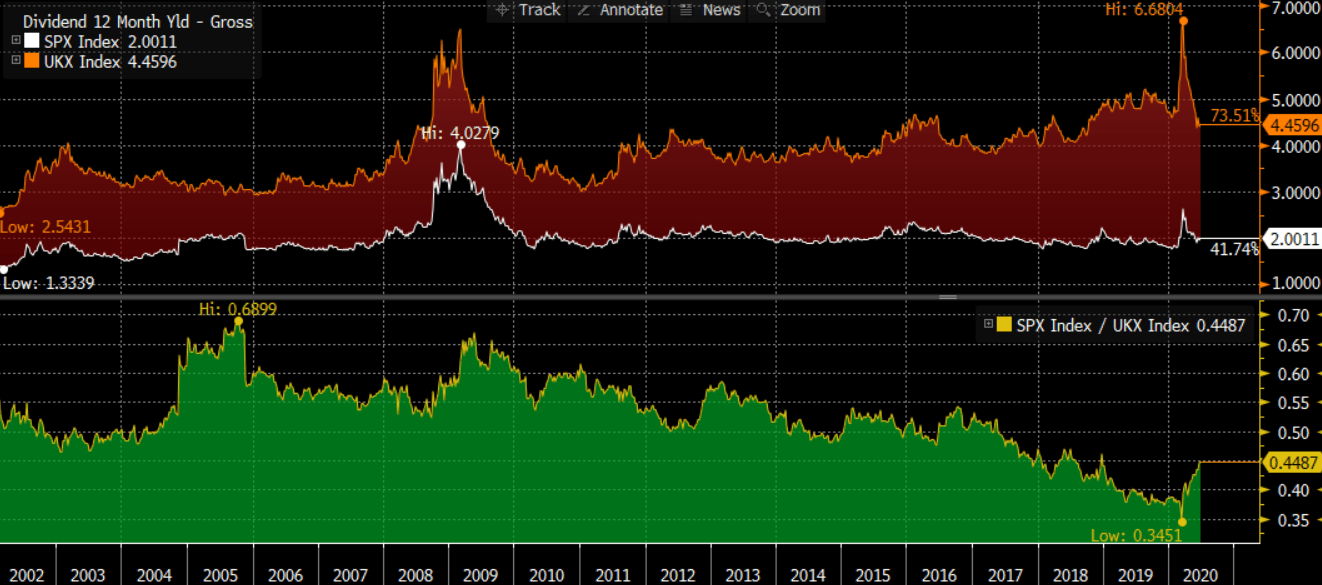 The forward P/E on the FTSE 100 is at only 12, while on the SPY that same measure is at 21.