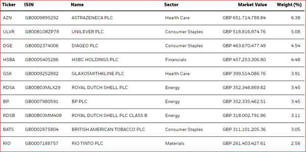 The top ten holdings for the FTSE 100 ETF, iShares Core FTSE 100 UCITS ETF: