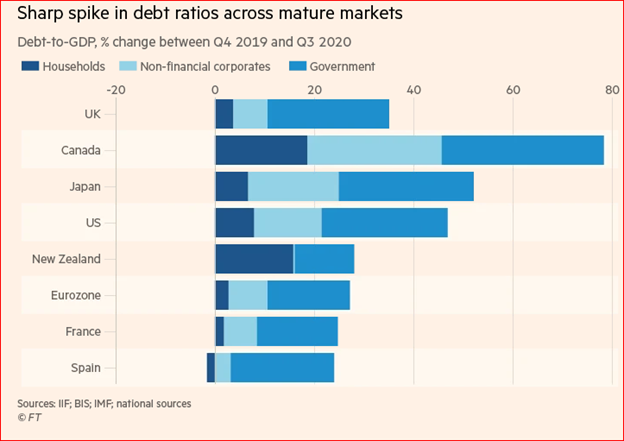 The problem with this policy is that Canada has one of the biggest private sector debt problems in the world. Even before the pandemic Canadian household and corporate debt was leading the world. And when the pandemic hit in early 2020 the government responded aggressively by pumping even more money into the system causing a sharp increase in debt in all sectors, government, household and corporate. Compared to most other developed countries Canada went much deeper into debt in all three sectors.