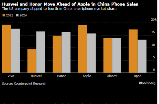 Huawei, Vivo and Honor have moved ahead of Apple in early 2024, according to Counterpoint Research. According to Counterpoint, Apple’s sales are down 24 percent this year so far while the total market in China shrank only 7 percent.