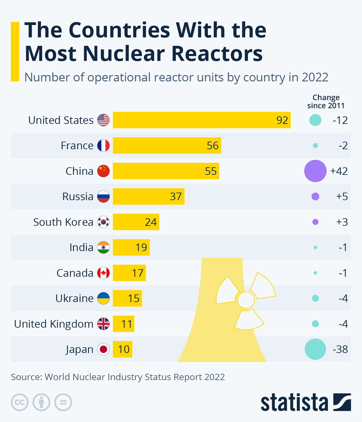 The U.S. and France now hold the lead, with the U.S. generating the most power from its large fleet of 92 plants.