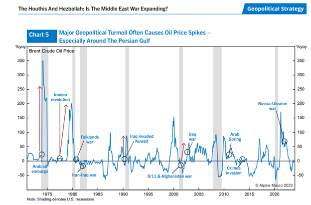 Any disruption to oil transport in the Persian Gulf would lead to higher prices, at least temporarily. Geopolitical turmoil usually involves higher oil prices, according to Dan Alamariu of Alpine Macro:
