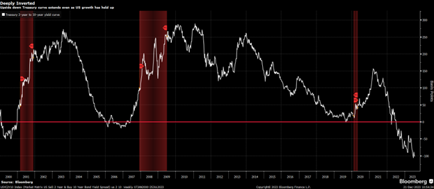 Regarding a recession, there is a signal that has a great track record of predicting a recession, well in advance of the onset. The inverted yield curve — a forecasting tool with demonstrated accuracy — has been anticipating a recession for close to two years. After the yield curve inverted in early 2022 the stock market declined from January to October 2022 by about 20 percent.