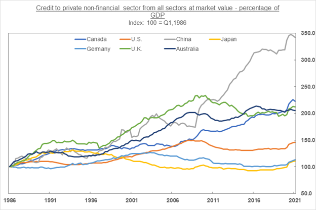 China leads the world in growing private sector debt while its enormous property sector makes up a world-leading twenty-five percent of GDP.