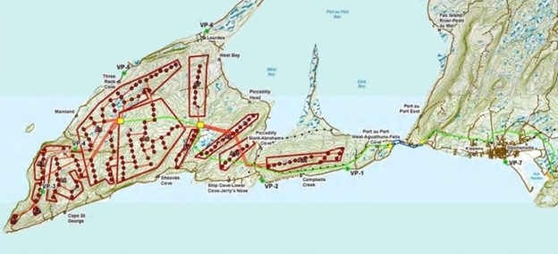 In this map of the proposed wind farm project on the Port au Port Peninsula, each red dot represents a wind turbine.
