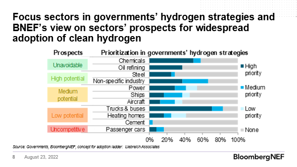 BNEF has projected that the uses for clean hydrogen have a wide range, some of which will be required to use hydrogen (labeled as unavoidable) to those that are extremely unlikely to adopt hydrogen, such as passenger cars where battery electric power works much better.