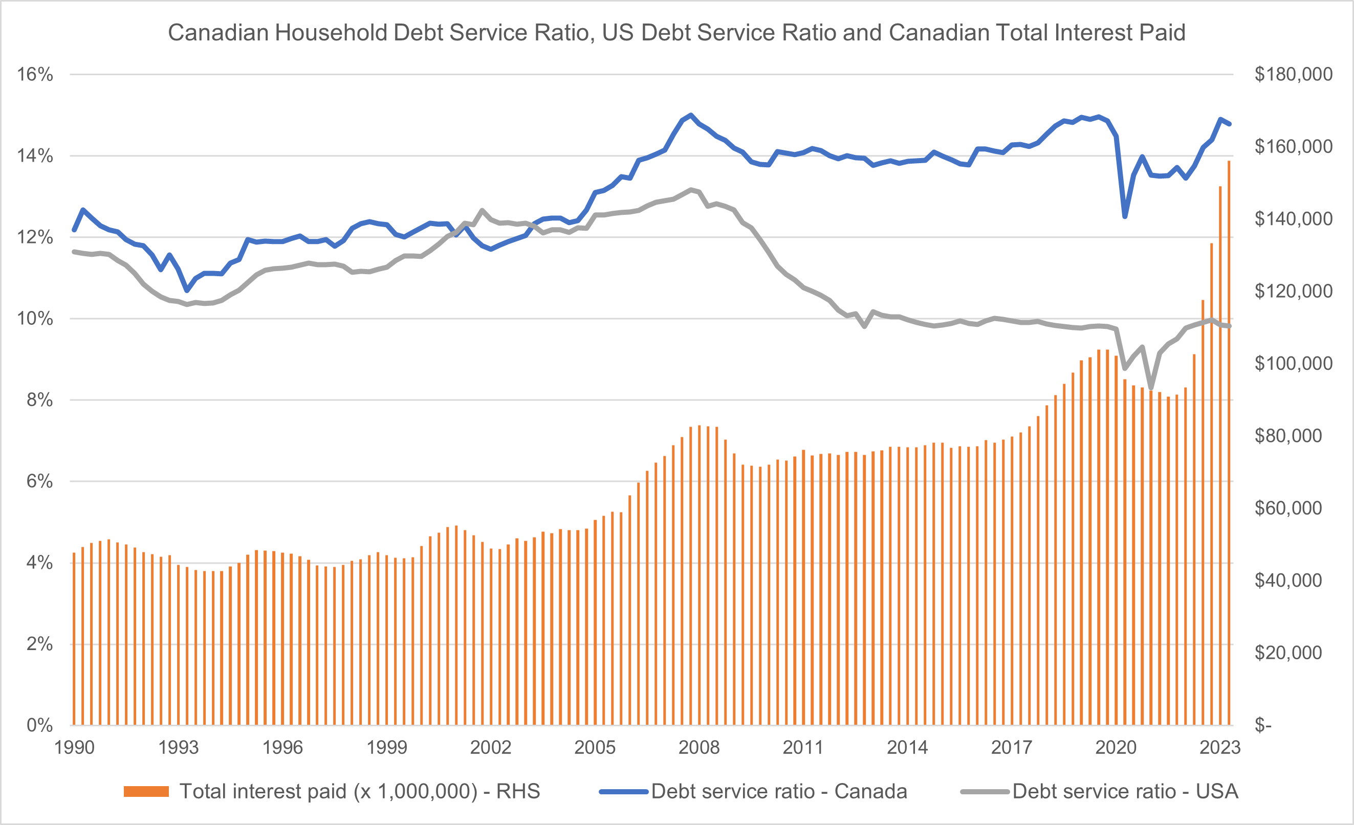 This surge in interest payments has not shown up yet in the total Canadian debt service ratio because mandatory principal payments have not moved up yet. But those principal payments on mortgages will get reset for all mortgages in the next few years, and many families will be devastated. Some will be unable to meet those higher payments.