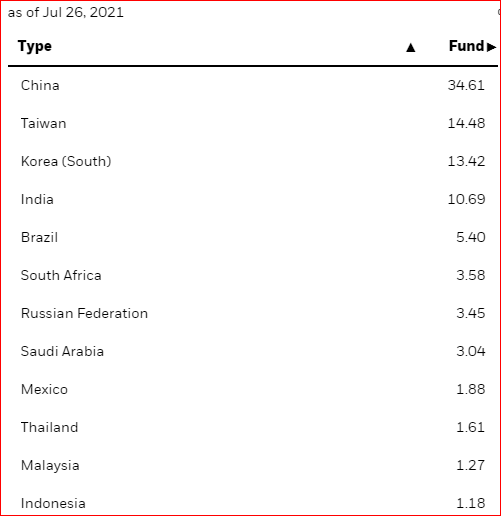 The MSCI Emerging Markets index covers emerging markets and an ETF by iShares (EEM) tracks that index. China and Taiwan are one-half of EEM’s value.