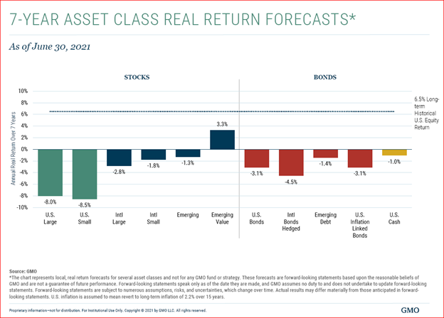 GMO LLC offers a 7-year forecast based on valuations. At this time, the only area that offers a decent future return is “emerging value”, and even that return is below average.
