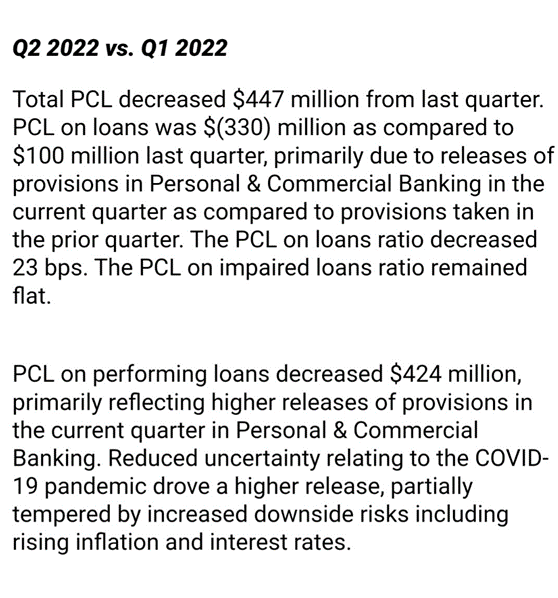 Obviously, the Royal Bank is aware of rising inflation and interest rates as they mention that in the last sentence of this excerpt from their earnings report. But they decided, after considering all of that, to “release” $447 million worth of provisions which go directly into boosting earnings.