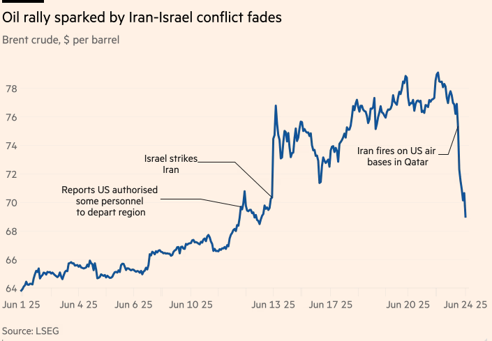 That’s a mere 10% move in the face of major hostilities between long-time enemies. And by June 24, after Iran retaliated by striking a U.S. base in Qatar, prices were right back where they started—$70.