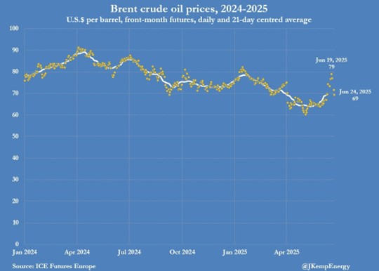 John Kemp’s chart of crude prices since early 2024 tells the story: despite headline-grabbing attacks, the long-term trend remains down.