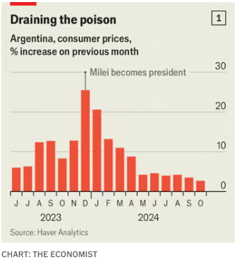 Milei, who campaigned for office with a chainsaw, has cut government spending by a third in inflation-adjusted terms, producing a budget surplus. Inflation has plunged from 13 percent monthly to 3 percent monthly.