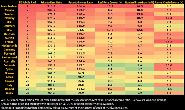 Canada has one of the largest housing bubbles in the world, according to Bloomberg Economics. The top 3 countries at risk are New Zealand, Canada and Sweden.