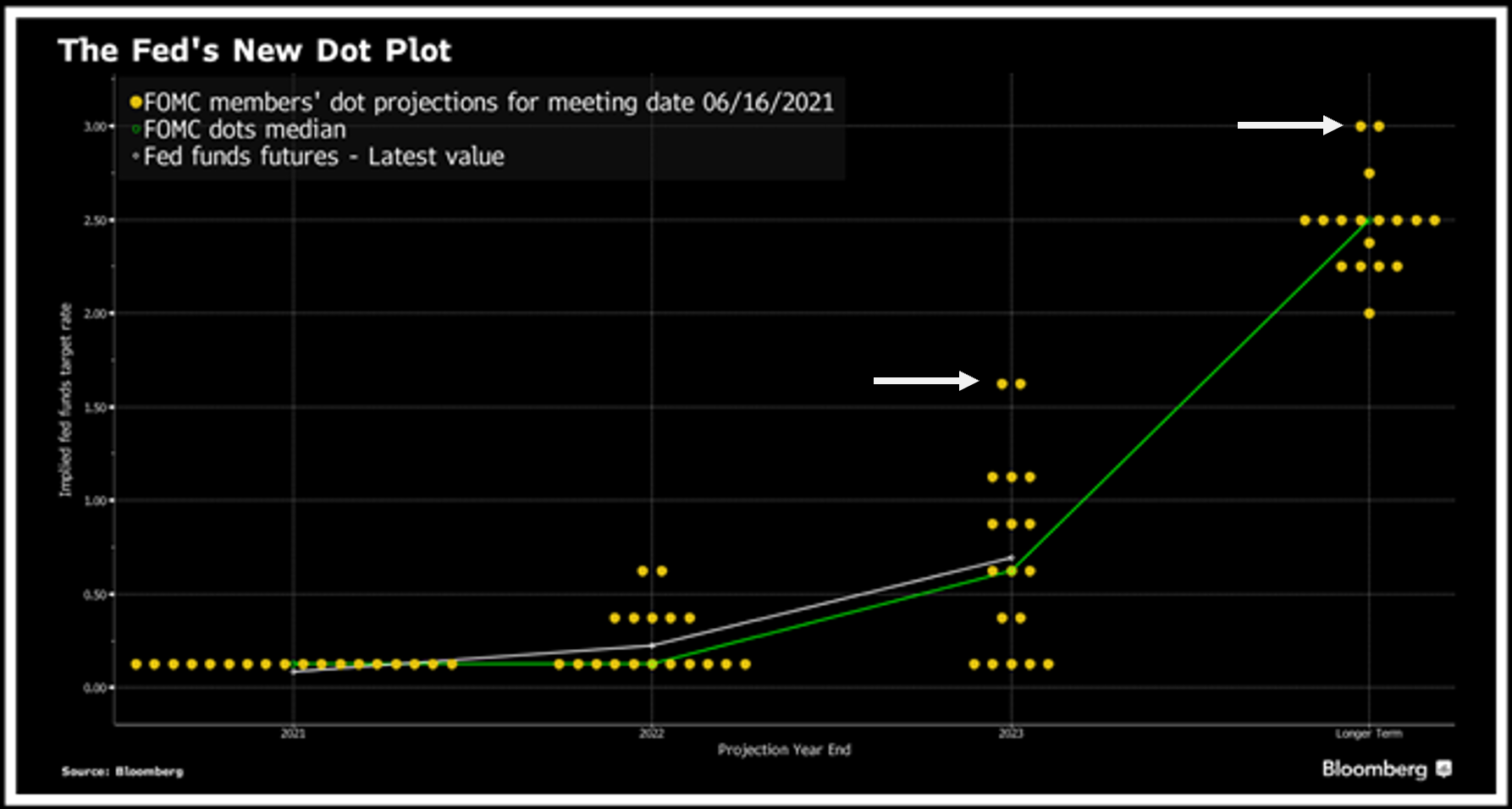 The Federal Reserve Open Market Committee has eighteen members and, in a major change, 13 of them indicated that interest rates could be headed higher sooner than expected. Although this change in forecast is significant for interest rates in 2023, the meeting ended with the decision to keep interest rates at zero — officially 0 to 0.25 percent — for a while longer. But this week’s shift in forecast had more impact on markets than the Fed decision to keep rates at zero.