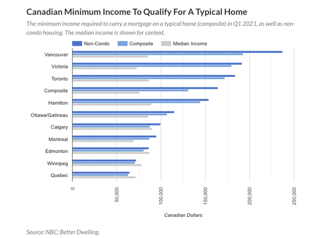 However, in Vancouver and Toronto, incomes are lower at about $70,000 to $75,000, less than 1/10 of the home price.