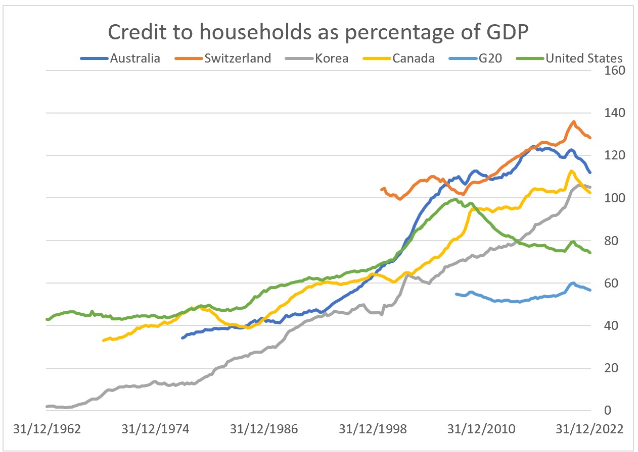 The Bank for International Settlements provides data showing Canada is one of only four countries where households debts are greater than 100 percent of GDP. Canada is at 102, Australia at 111, Korea at 105 and Switzerland is at 128. The U.S. is at 74 percent while the G20 average is even lower at 62 percent.