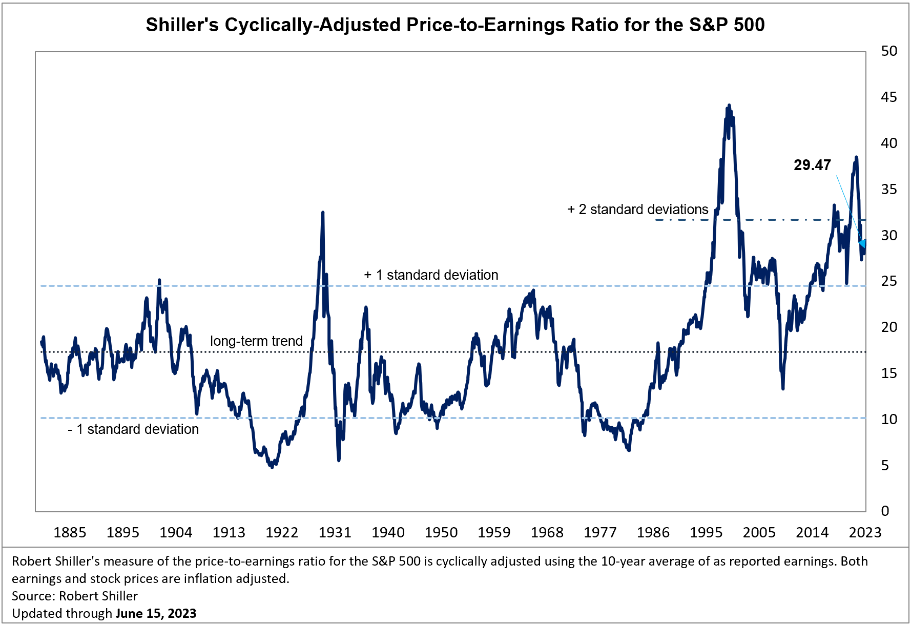 The Shiller ratio, known as the Cyclically Adjust Price Earnings Ratio for the S&P 500, reached a peak in 1999 with a ratio of stock prices to earnings of about 45, even higher than 1929. This high water mark in the ratio led to a bear market that lasted two years and took more than 50 percent off the S&P 500.