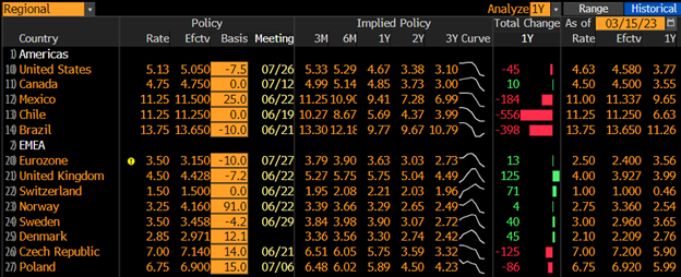 The 6m (six months) column shows higher rates. In the US the rate is listed as 5.13 percent now, and 5.29 percent in six months. Similar increases are shown for Canada, up to 5.14 percent and the Eurozone 3.90 percent. This means that the market sees one or two more rate hikes this year, starting in July for the US Federal Reserve.