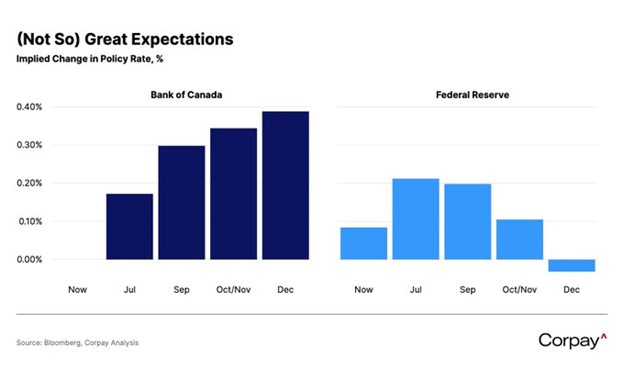 The BOC rate hike this week caused a huge change in expectations, which are now much above expectations for increases by the Federal Reserve, according to foreign exchange experts Corpay: